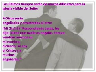 las estrellas; y en la tierra apretura de las naciones por la confusión del sonido del mar y de las ondas; desfalleciendo los hombres a causa del temor y expectación de las cosas que sobrevendrán a la redondez de la tierra; porque las virtudes de los cielos serán conmovidas»). En Marcos 13: 5-6, Jesús, respondiéndonos, nos dice… «Y Jesús respondiéndoles, comenzó a decir: Mirad, que nadie os engañe. Porque vendrán muchos en mi nombre, diciendo: Yo Soy el Cristo; y engañarán a muchos». ¿En qué serán engañados? En doctrinas y enseñanzas de demonios. «Pero el Espíritu dice manifiestamente, que en los postreros tiempos algunos apostatarán de la fe, escuchando a espíritus de error y a doctrinas de demonios» (1Timoteo 4:1). En el escenario que es la iglesia, dentro de ella se harán manifiestas conductas de creyentes que el Espíritu Santo reprueba y advierte por boca del Apóstol Pablo… «Esto también sepas, que en los postreros días vendrán tiempos peligrosos: Que habrá hombres amadores de sí mismos , avaros, vanagloriosos, soberbios, maldicientes, desobedientes de sus padres, ingratos, impuros. Sin afecto natural, desleales, calumniadores, sin templanza, sin mansedumbre, sin bondad, traidores, arrebatados, infatuados, amadores de los deleites más que de Dios; teniendo apariencia de piedad (RVI960) [o, se cubren con un manto de apariencia en la
