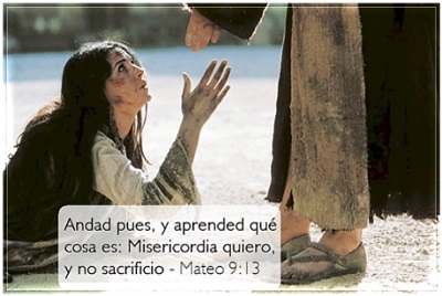 Y el día había comenzado a declinar; y llegándose los doce, le dijeron: Despide a la multitud, para que yendo a las aldeas y heredades de alrededor, procedan a alojarse y hallen viandas; porque aquí estamos en lugar desierto. Y les dice: Dadles vosotros de comer. Y dijeron ellos: No tenemos más que cinco panes y dos pescados, si no vamos nosotros a comprar viandas para toda esta multitud. Y eran como cinco mil hombres. Entonces dijo a sus discípulos: Hacedlos sentar en grupos, de cincuenta en cincuenta. Y así lo hicieron, haciéndolos sentar a todos. Y tomando los cinco panes y los dos pescados, mirando al cielo los bendijo, y partió, y dio a sus discípulos para que los pusiesen delante de la multitud. Y comieron todos, y se saciaron; y alzaron lo que les sobró, doce cestos de pedazos.”. Obras de perdón: Leemos Juan 8.3-11 “Entonces los escribas y los fariseos le traen una mujer tomada en adulterio; y poniéndola en medio, le dicen: Maestro, esta mujer ha sido tomada en el mismo hecho, adulterando; y en la ley Moisés nos mandó apedrear a las tales. Tú pues, ¿qué dices? Mas esto decían tentándole, para poder acusarle. Pero Jesús, inclinado hacia abajo, escribía en tierra con el dedo. Y como perseverasen preguntándole, se enderezó, y les dijo: El que de vosotros esté sin pecado, sea el primero en arrojar la piedra contra ella. Y volviéndose a inclinar hacia abajo, escribía en tierra. Oyendo pues ellos esto (redargüidos de la conciencia),