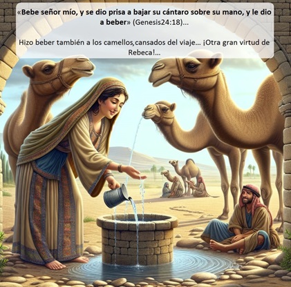 “Y dijo: SEÑOR, Dios de mi señor Abraham, dame, te ruego, el tener hoy buen encuentro, y haz misericordia con mi señor Abraham. He aquí yo estoy junto a la fuente de agua, y las hijas de los varones de esta ciudad salen por agua. Sea, pues, que la doncella a quien yo dijere: Baja ahora tu cántaro, para que yo beba; y ella respondiere: Bebe, y también daré de beber a tus camellos, que ésta sea la que aparejaste a tu siervo Isaac; y en esto conoceré que habrás hecho misericordia con mi señor. Y aconteció que antes que él acabase de hablar, he aquí Rebeca que salía, (la cual había nacido a Betuel, hijo de Milca, mujer de Nacor hermano de Abraham) con su cántaro sobre sus hombros. Y la doncella era de muy hermoso aspecto, virgen, a la que varón no había conocido; la cual descendió a la fuente, y llenó su cántaro, y se volvía. Entonces el siervo corrió hacia ella, y dijo: Te ruego que me des a beber un poco de agua de tu cántaro. Y ella respondió: Bebe, señor mío: y se dio prisa a bajar su cántaro sobre su mano, y le dio a beber. Y cuando acabó de darle a beber, dijo: También para tus camellos sacaré agua, hasta que acaben de beber”.