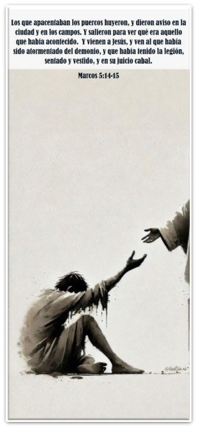 y Marcos 5.1-17 "1Vinieron al otro lado del mar, a la región de los gadarenos. 2 Y cuando salió él de la barca, en seguida vino a su encuentro, de los sepulcros, un hombre con un espíritu inmundo, 3 que tenía su morada en los sepulcros, y nadie podía atarle, ni aun con cadenas. 4 Porque muchas veces había sido atado con grillos y cadenas, mas las cadenas habían sido hechas pedazos por él, y desmenuzados los grillos; y nadie le podía dominar. 5 Y siempre, de día y de noche, andaba dando voces en los montes y en los sepulcros, e hiriéndose con piedras. 6 Cuando vio, pues, a Jesús de lejos, corrió, y se arrodilló ante él. 7 Y clamando a gran voz, dijo: ¿Qué tienes conmigo, Jesús, Hijo del Dios Altísimo? Te conjuro por Dios que no me atormentes. 8 Porque le decía: Sal de este hombre, espíritu inmundo. 9 Y le preguntó: ¿Cómo te llamas? Y respondió diciendo: Legión me llamo; porque somos muchos. 10 Y le rogaba mucho que no los enviase fuera de aquella región. 11 Estaba allí cerca del monte un gran hato de cerdos paciendo. 12 Y le rogaron todos los demonios, diciendo: Envíanos a los cerdos para que entremos en ellos. 13 Y luego Jesús les dio permiso. Y saliendo aquellos espíritus inmundos, entraron en los cerdos, los cuales eran como dos mil; y el hato se precipitó en el mar por un despeñadero, y en el mar se ahogaron. 14 Y los que apacentaban los cerdos huyeron, y dieron aviso en la ciudad y en los campos. Y salieron a ver qué era aquello que había sucedido. 15 Vienen a Jesús, y ven al que había sido atormentado del demonio, y que había tenido la legión, sentado, vestido y en su juicio cabal; y tuvieron miedo. 16 Y les contaron los que lo habían visto, cómo le había acontecido al que había tenido el demonio, y lo de los cerdos. 17 Y comenzaron a rogarle que se fuera de sus contornos."