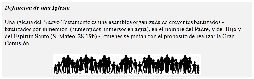 Una iglesia del Nuevo Testamento es una asamblea organizada de creyentes bautizados - bautizados por inmersión (sumergidos, inmersos en agua), en el nombre del Padre, y del Hijo y del Espíritu Santo (S. Mateo, 28.19b) -, quienes se juntan con el propósito de realizar la Gran Comisión.