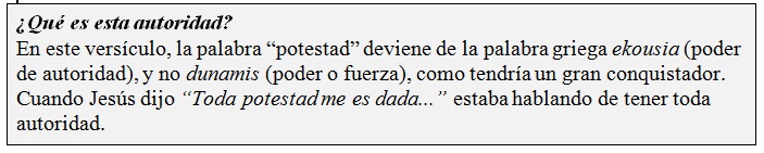 En este versículo, la palabra “potestad” deviene de la palabra griega ekousia (poder de autoridad), y no dunamis (poder o fuerza), como tendría un gran conquistador. Cuando Jesús dijo “Toda potestad me es dada...” estaba hablando de tener toda autoridad.