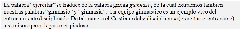 Busque I Timoteo 4:7. Dios dice que debemos ejercitarnos para la P __ __ __ __ __ .