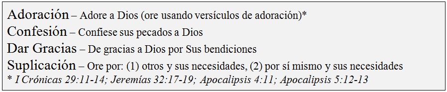 ¡Una manera maravillosa para empezar un tiempo de oración es expresando alabanza a Dios! En una oración de adoración, usted expresa sus profundos sentimientos hacia Dios hacia Dios; los cuales) resultan de Su amor, sabiduría, presencia, poder, conocimiento, gracia, santidad, grandeza, y Sus otros atributos divinos. Este tipo de oración siempre será una ocasión de gozo. Recuerde que nuestra adoración debe ser reservada para Dios, no para proyectos, ministerios, u obras hechas en Su nombre. Cuando está en el centro de Su voluntad, el deseo de alabarle a El vendrá naturalmente. Memorice pasajes que hablan de la alabanza a Dios y úselos mientras le adore (I Crónicas 29:11-14; Éxodo 15:11; I Pedro 1:15-16; Jeremías 32:17-19; Apocalipsis 4:11; 5:12-14).