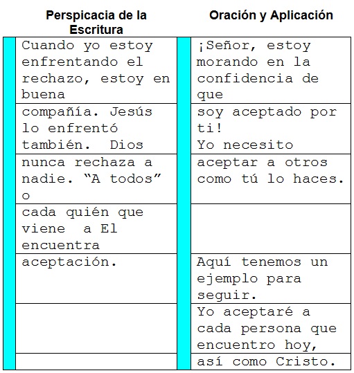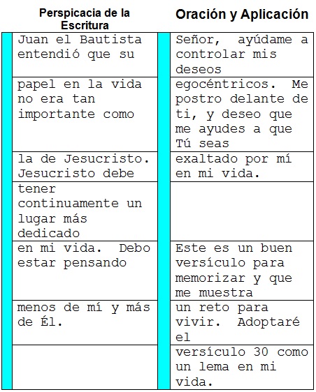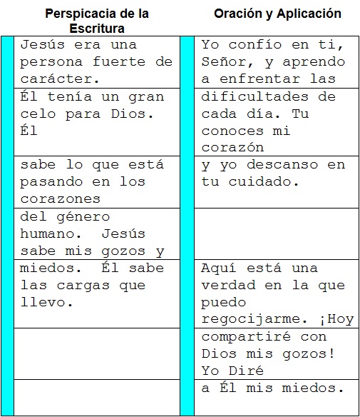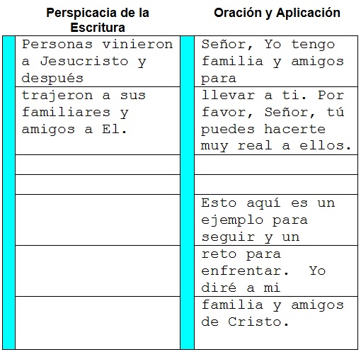 Escriba una perspicacia de su leer. Puede ser algo que aprendió o algo que Dios puso en su corazón. Esta perspicacia no necesita venir del pasaje completo leído; puede venir de un solo versículo o de una expresión dentro de un versículo. Anotando las perspicacias nos ayudará a solidificarla en nuestro propio pensamiento. Para ayudarle a hacer aplicación personal, se incluye la siguiente lista de preguntas prácticas: