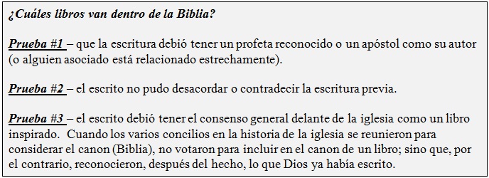 3. El Antiguo Testamento, antes del tiempo de Cristo, había sido escrito y aceptado en la comunidad judía. El canon del Antiguo Testamento de la época de Cristo se asegura de nuestro propio, y eso no contiene 14 libros apócrifos faltos de inspiración y desechables. Los libros apócrifos no fueron citados por ningún escritor del Nuevo Testamento, ni tampoco los afirmó Jesús en ninguna parte.