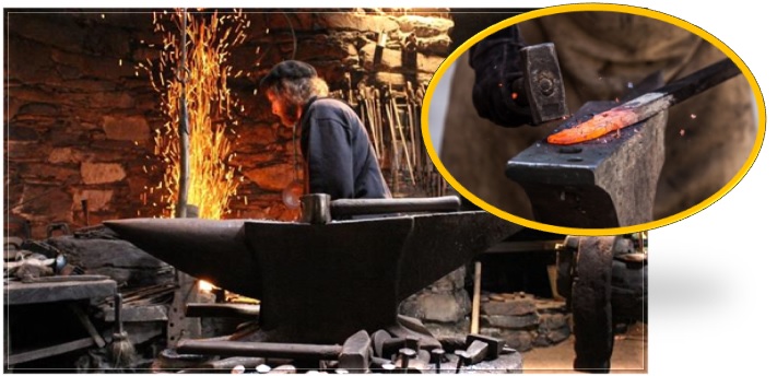 Para que no mermara su incandescencia (que poco a poco iba disminuyendo) y por ende su eficacia, el hierro era llevado una y otra vez de la llama al yunque y del yunque a la llama; de esta manera, el herrero lo podía moldear fácilmente con el martillo hasta darle la forma esperada.